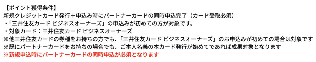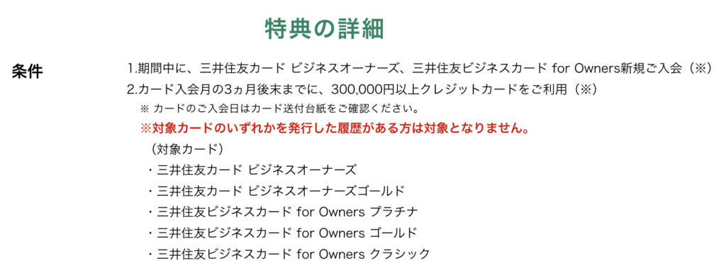 すでにこの「三井住友カード ビジネスオーナーズ」の前身のカードとなる「三井住友ビジネスカード for Owners」を所有したことのある方と当然ながらこの「ビジネスオーナーズ」を発行したことのある方は、対象外となります。