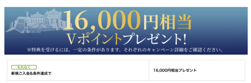 カード入会月+3か月後の月末までに、30万円以上の利用で16,000円相当のVポイントがもらえます。